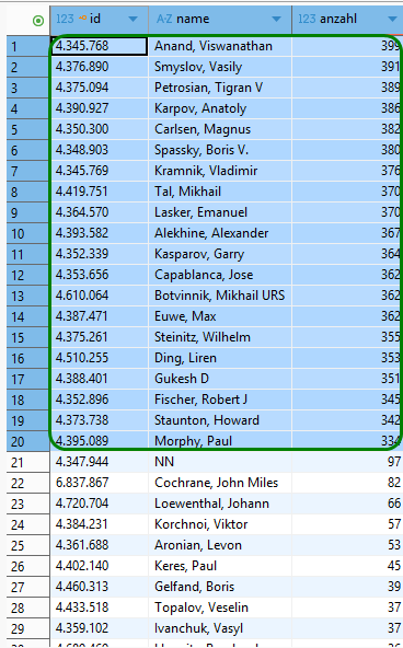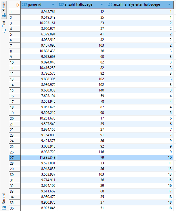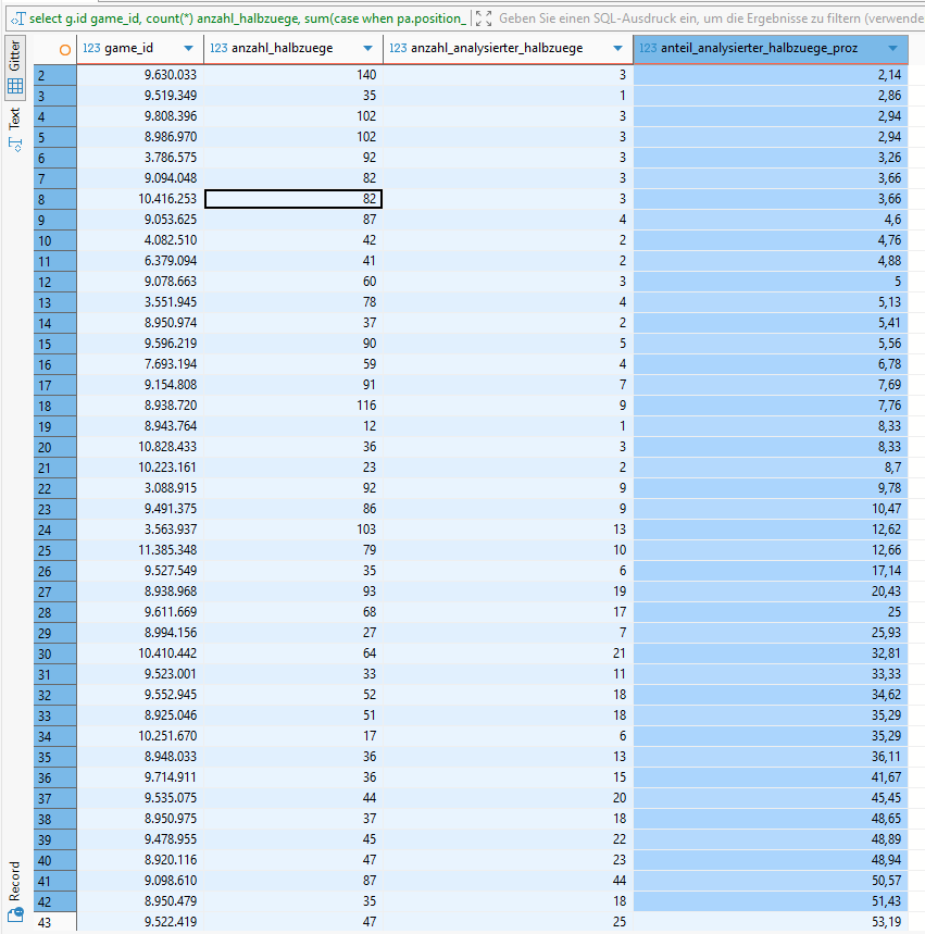 Nachdem nun die Stockfish-Analysen abgeschlossen sind, werfen wir mit einem Adhoc-SQL-Skript nochmal einen Blick auf das erzielte Gesamtergebnis.