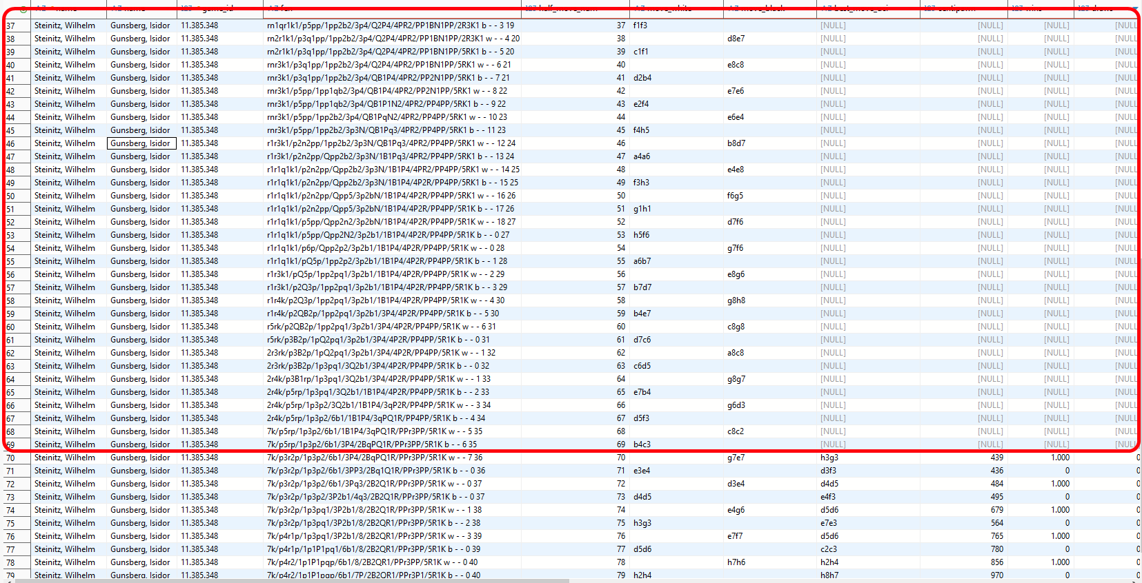Zumindest in diesem Beispiel ist auch ersichtlich, dass die Stellung vor dem ersten analysierten 21. Halbzug bereits bekannt war und es sich dabei um kein Duplikat handelt, was an den verschiedenen Spieler-IDs ersichtlich ist. Von daher gibt es keinen Grund, die Analyse-Resultate für diese Partie zu verwerfen.