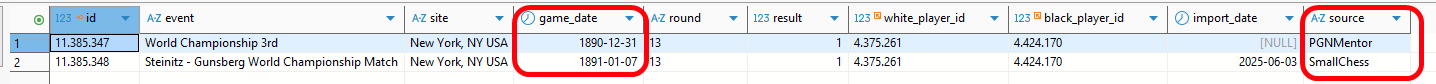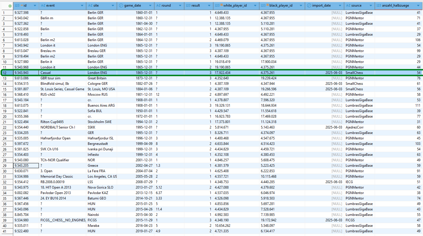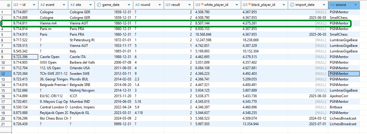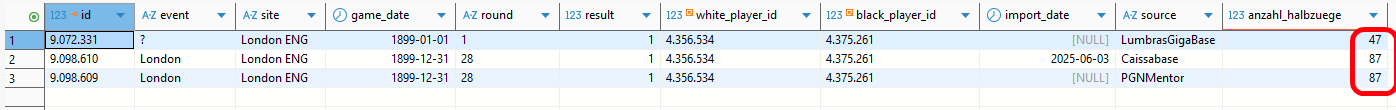 Anhand der selben Anzahl Halbzüge und der übrigen Idente kann man von den beiden unteren Partien der obigen Liste von Duplikaten ausgehen. Die erste Zeile würden wir wegen der selben Spieler-IDs und dem selben Jahr als wahrscheinlich unvollständiges Duplikat wie oben gesehen zurückweisen.