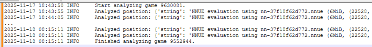 Damit können wir die Gesamtlaufzeit für alle zu analysierenden Partien abschätzen (13,5 / 125 * 1179). Dies entspricht einer Laufzeit von ca. 5,3 Tagen!