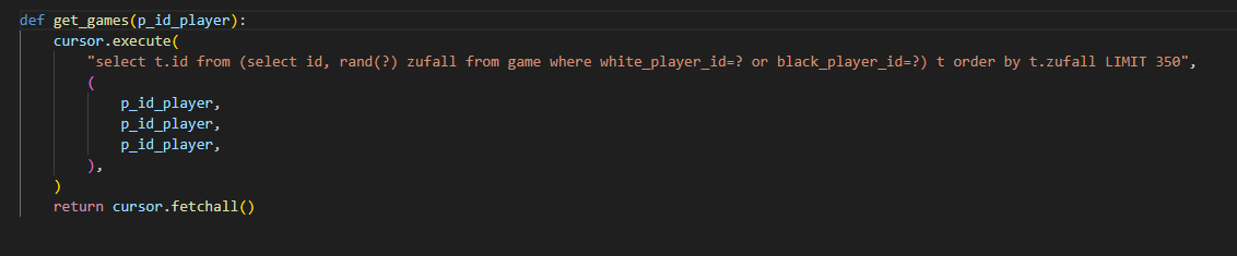 Technisch ist diese Anforderung leicht zu realisieren. Dazu modifizieren wir die bestehende SQL-Abfrage für die Ermittlung der zu analysierenden Partien, indem wir pro Zeile einen Zufallswert generieren, diese Liste danach (zufällig) sortieren und davon die ersten 350 Partien verwenden. Damit die Wiederaufsetzbarkeit unseres Programms gewährleistet bleibt, verwenden wir für die rand()-Funktion von MariaDB, die diesen Zufallswert generiert, einen sogenannten SEED, der dafür sorgt, dass die erzeugten Zufallszahlen bei Wiederholung des Programms mit dem selben SEED exakt reproduziert werden. Als konkreten Wert für SEED nehmen wir die jeweilige Player ID. Wir könnten stattdessen auch eine beliebige Zahlenkonstante verwenden.