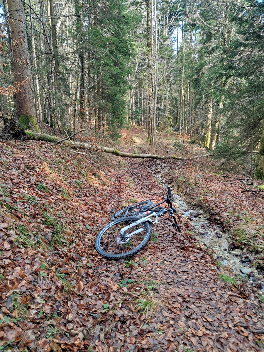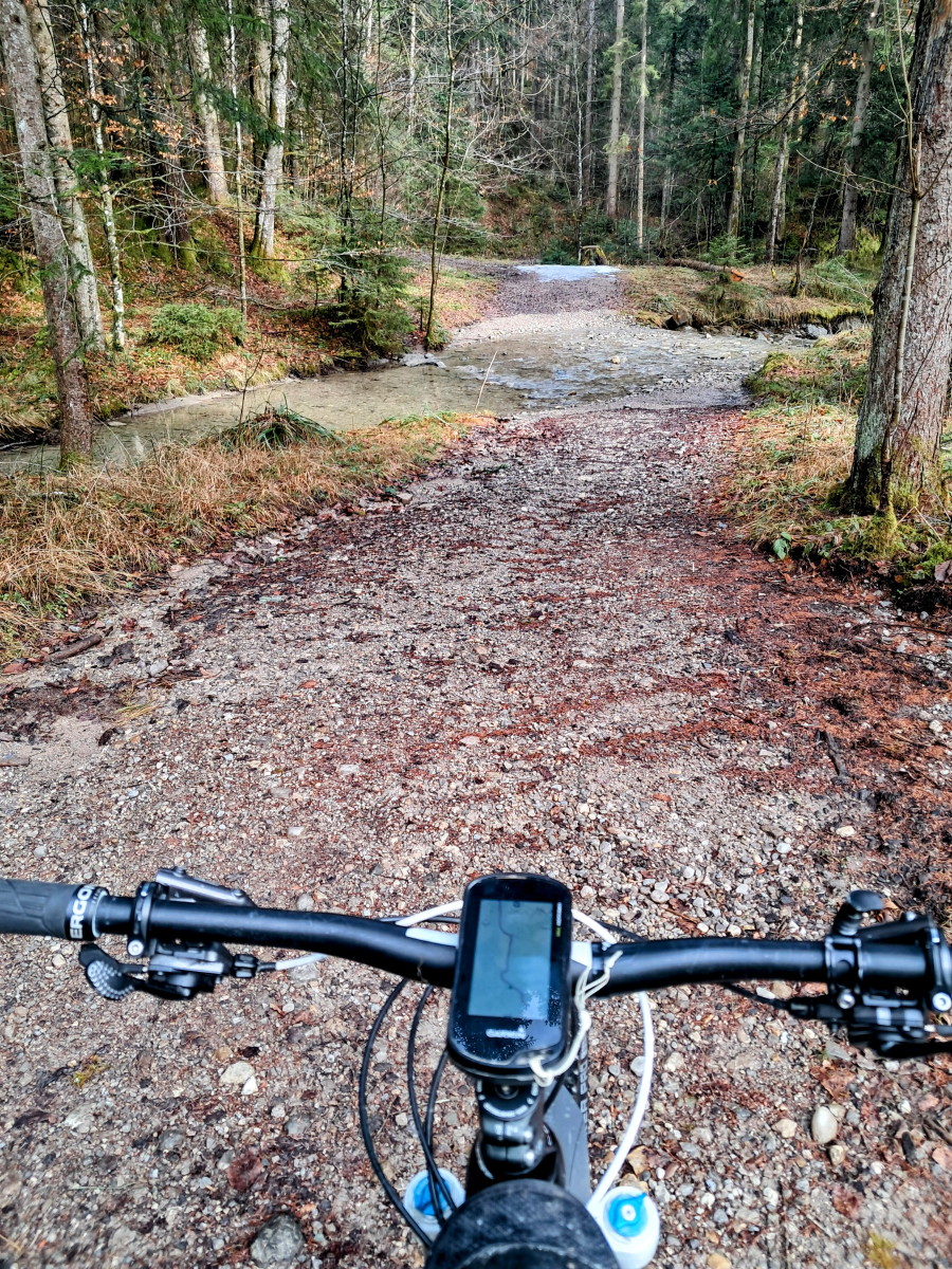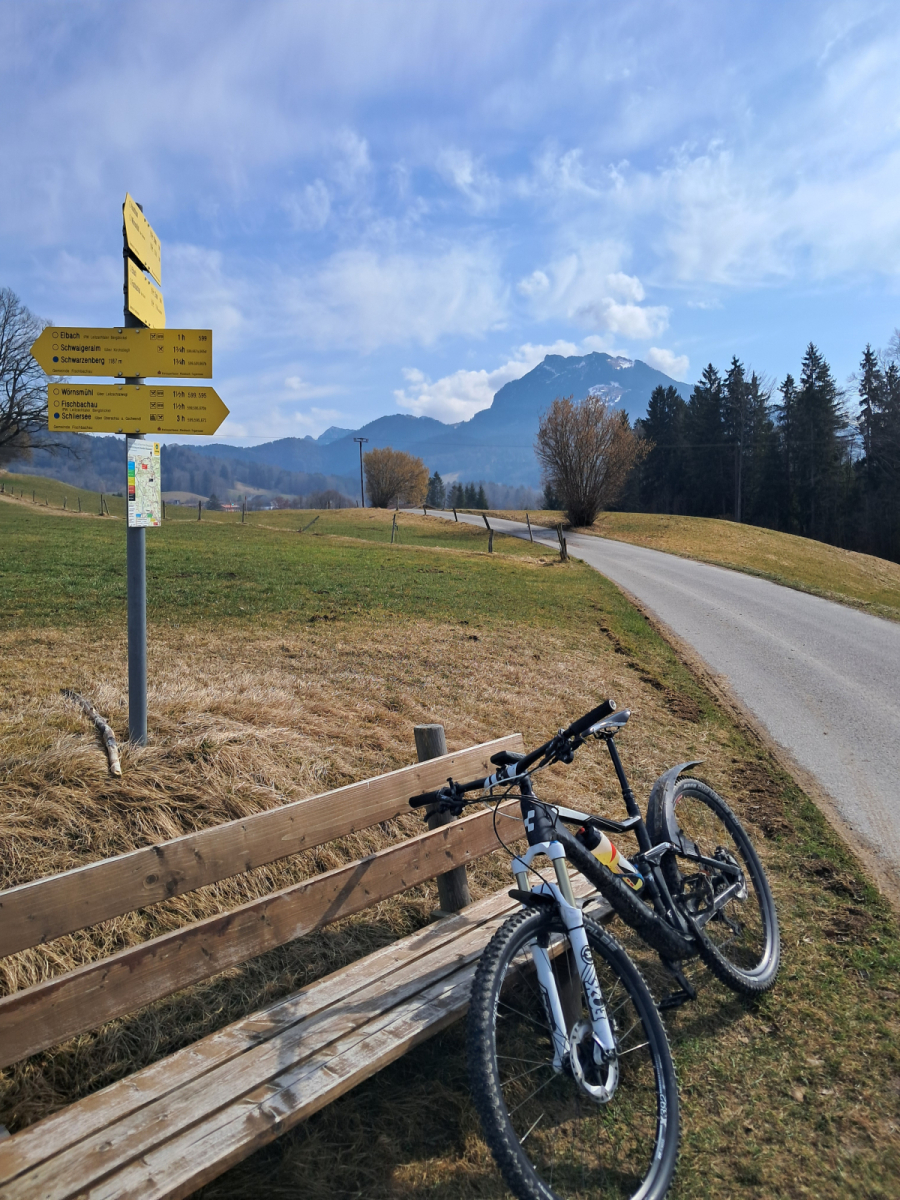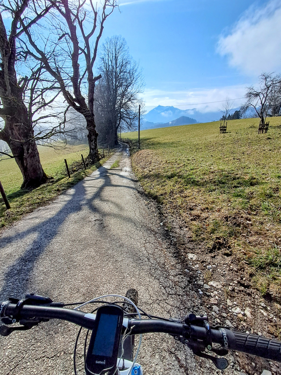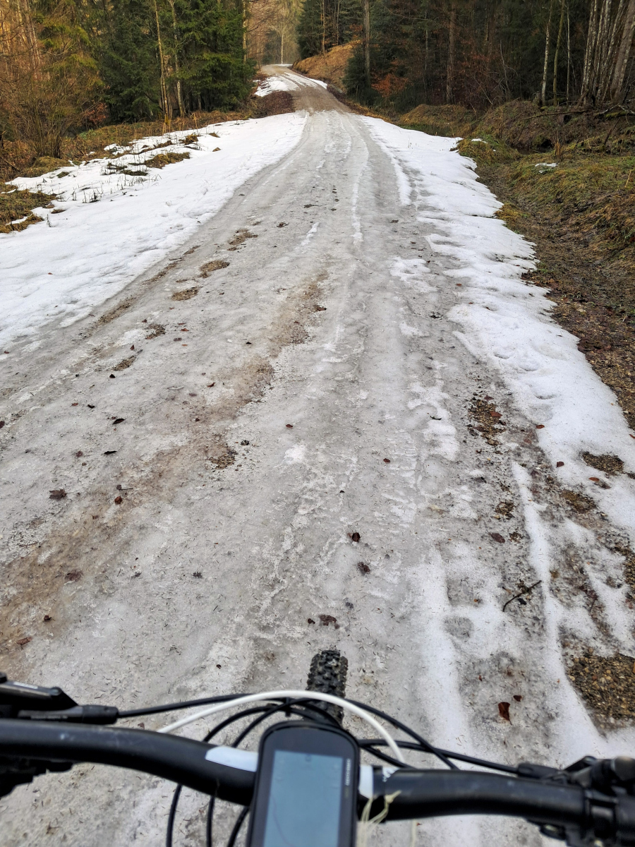 Moser Bike Guide 8 – Genußtouren Oberbayern 2 – Tour 29 – Miesbacher Auer Berg-Tour versehentlich im Gegenuhrzeigersinn gefahren, was sich im nachhinein als Glück herausgestellt hat. Zum einen wurde so die fiese Rampe von Au nach Hocheck rauf vermieden. Zum anderen konnte der vereiste Abschnitt vor Wörnsmühl wenigstens abwärts gefahren werden.