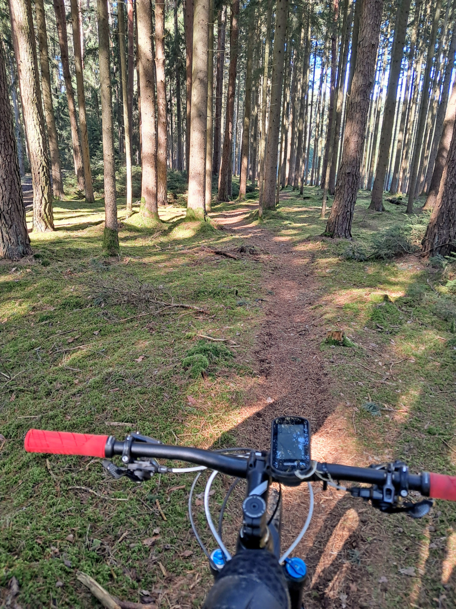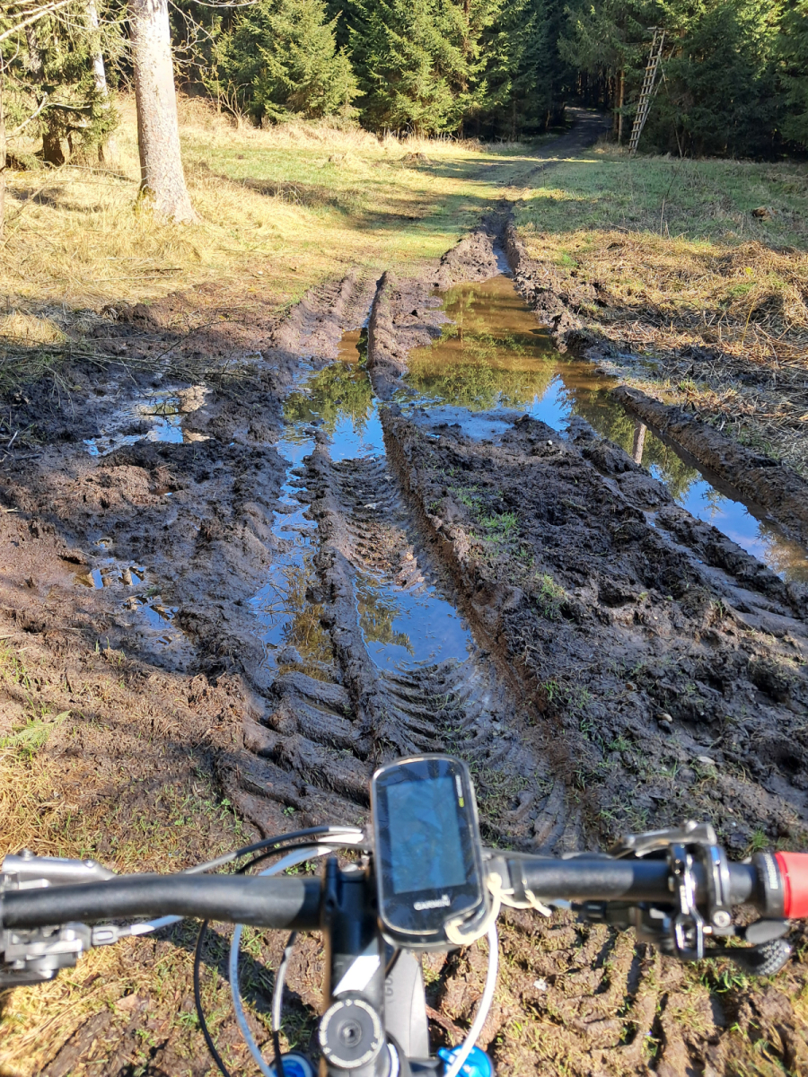 Die Waldwege waren oft regelrecht sumpfig und daher anstrengend zu fahren. Keine Biker getroffen, außer Hasen und Reh-Herden auch sonst kaum eine Menschenseele hier unterwegs – tiefste Provinz eben🤠