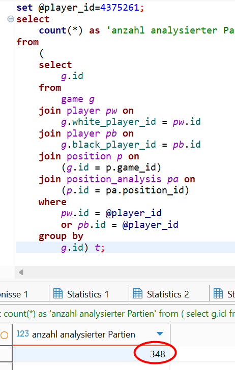Danach prüfen wir den Umfang der soweit erzielten Ergebnisse in der Datenbank, nämlich die Anzahl der vollständig analysierten Partien.