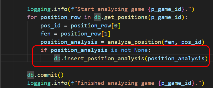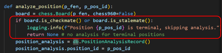 Und wie nicht anders zu erwarten bietet die python-chess Bibliothek genau die Funktionalität, um diese Situationen zu erkennen. Damit korrigieren wir in unser Programm, um die Analyse solcher Stellungen zu unterdrücken.