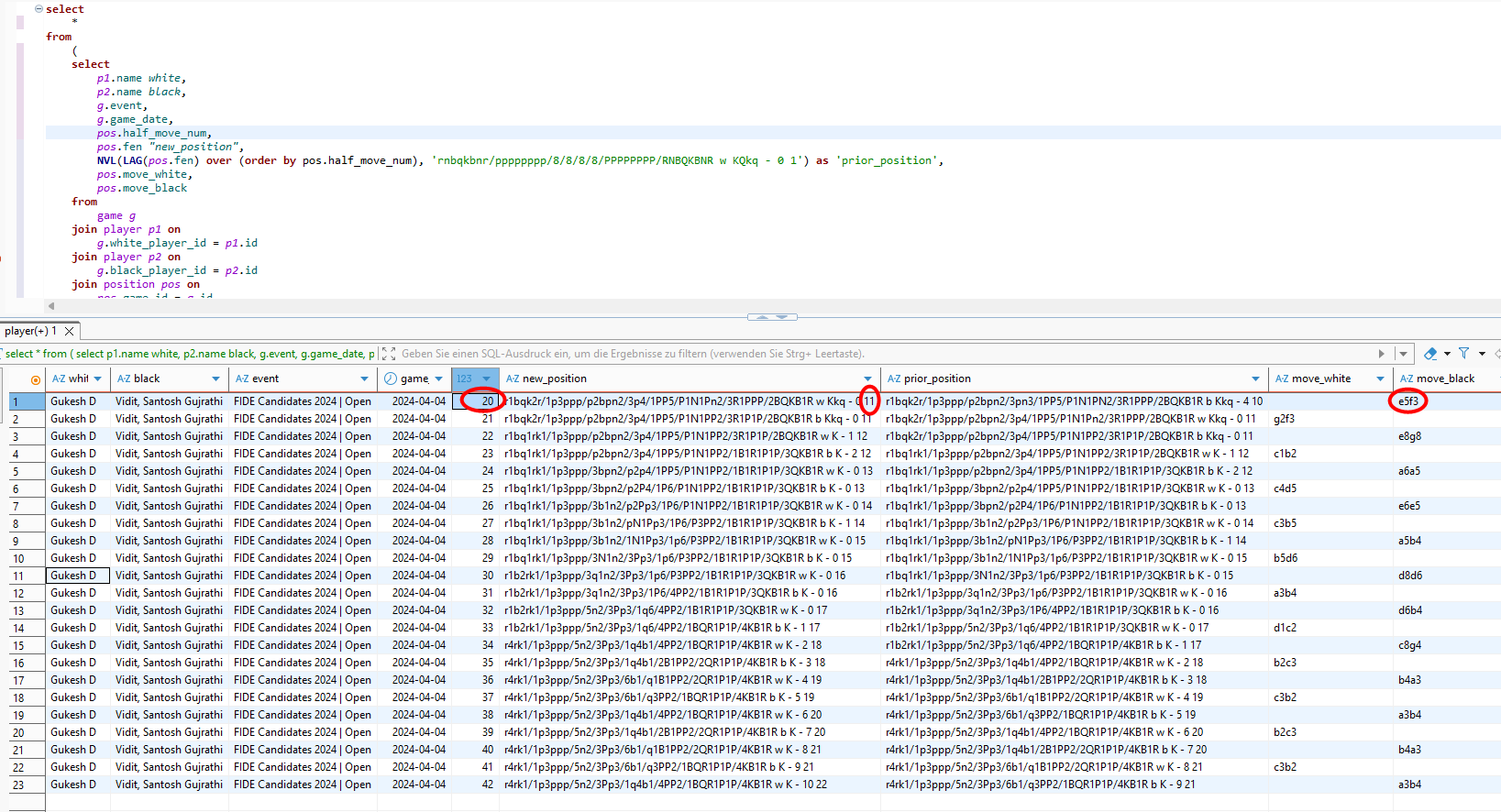 - Beim Eintrag der Züge zu einer Partie wird gleichfalls die resultierende Stellung als FEN konstruiert und in der Tabelle position gespeichert.