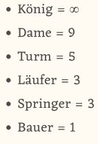 Die Bewertung von Schachstellungen vor und nach einem Zug hat eine lange Geschichte und hat vielfältige Facetten. Wir wollen das hier nicht ausführlich darstellen. Auch wenn Materialvorteil nur ein Aspekt bei der Stellungsbewertung ist, war dieser Maßstab seit langem etabliert, da er im Gegensatz zu Tempo- oder Positions-Vorteilen leicht quantifizierbar ist. Ausgehend von den relativen Figurenwerten untereinander hat sich historisch folgende Metrik als Quasi-Standard herausgebildet.
