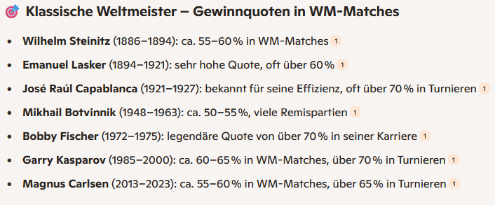 Man kann anhand obiger Statistik bereits das Problem erahnen. Hier werden unterschiedliche Maßstäbe verwendet! Selbst wenn man eine vergleichbare Grundlage schafft, also z.B. nur WM-Matches oder sämtliche Spiele berücksichtigt, ist die Aussagekraft von erzielten Ergebnissen gering. Zum einen erreichen Weltklasse-Spieler ihre maximale Spielstärke in unterschiedlichen Abschnitten ihres Lebens und halten diese auch unterschiedlich lange aufrecht, abhängig von Gesundheit und Alter. Zum anderen ist die allgemeine Spielstärke heutiger Schachspieler enorm gewachsen und es ist offenkundig schwerer, gegen einen gleichwertigen Gegner zu gewinnen, der ebenfalls mit dem gesamten verfügbaren Wissen über Schachtheorie und Eröffnungssysteme ausgestattet ist. Der Graben zwischen den Spielstärken heutiger Großmeistern ist weniger tief als von 100 Jahren.