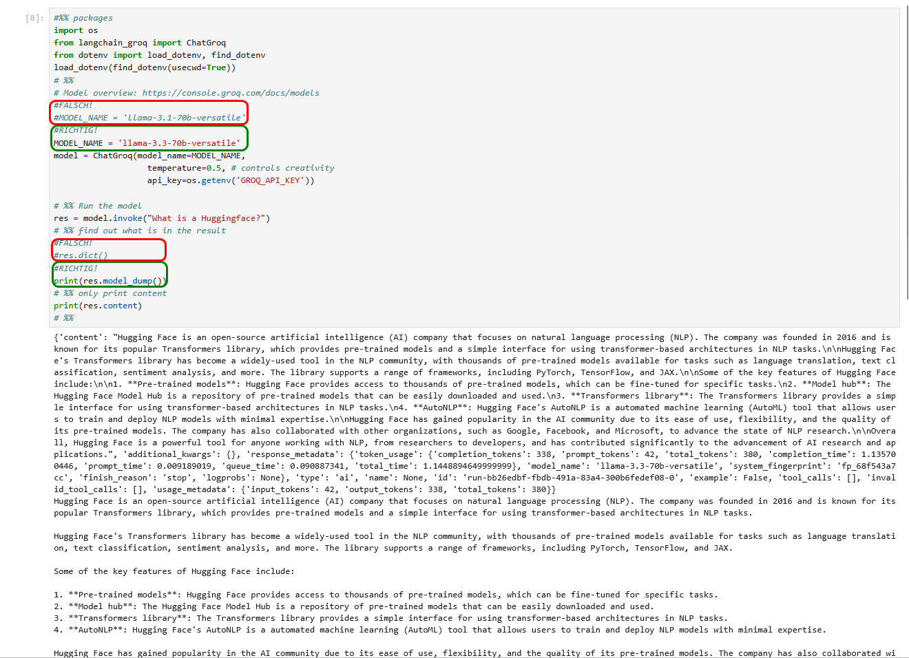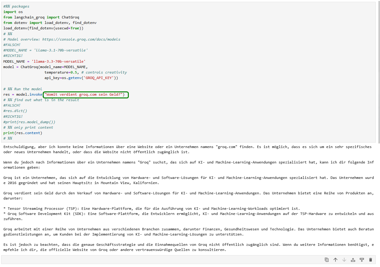 Da ich keinen kommerziellen API-Schlüssel bei OpenAI erwerben wollte, habe ich das erste Beispiel auf den Seiten 94-96 nicht ausprobiert, sondern stattdessen die Beispiele für die kostenlosen LLMs von Groq genutzt. Im Buch wird das zugehörige Python-Skript falsch benannt, es muss auf S.97 unten „20_model_chat_groq.py“ statt „10_model_chat_groq.py“ heißen. Aber auch das richtige Skript bricht mit einer Fehlermeldung ab, da das verwendete Modell „llama-3.1-70b-versatile“ nicht mehr verfügbar ist. Stattdessen kann das Nachfolge-Modell „llama-3.3-70b-versatile“ verwendet werden. Zudem ist zusätzlich ein Methodenaufruf nicht mehr aktuell und die zugehörige print-Anweisung fehlt. Damit funktionert das Programm momentan.
